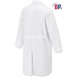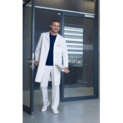 Länge N= 110 cm; L= 120 cm, 1/1-Arm, Reverskragen, verdeckte Druckknopfleiste, 1 Brusttasche, 2 Seitentaschen, Rückenschlitz, Rückengurt, Gewebegewicht 215 g/m², 100% Baumwolle, kochfest