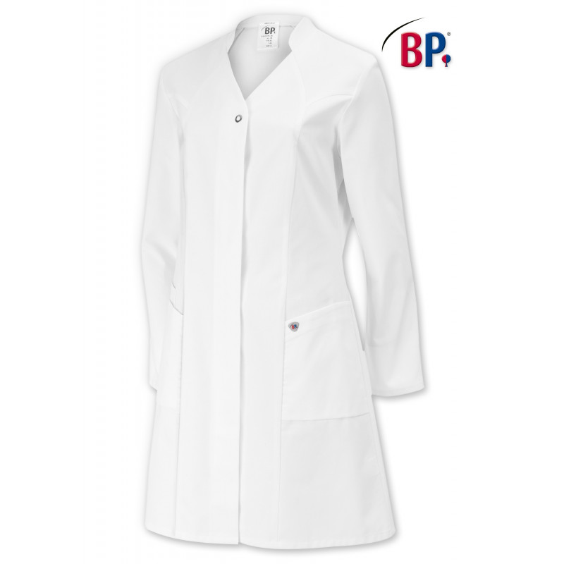 Länge 90 cm, 1/1-Arm, besonders leichtes atmungsaktives Baumwollgewebe, Stehkragen mit V-Ausschnitt, 2 geräumige Seitentaschen und 1 Piepertasche, schmale Passform, Gewebegewicht 205 g/m², 100% Baumwolle, kochfest